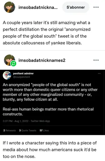 (Screenshot of a Twitter post by @loudpenitent: “An anonymized ‘people of the global south’ is not worth more than domestic queer citizens or any other member of any other marginalized community - or, bluntly, any fellow citizen at all. Real-ass human beings matter more than rhetorical constructs.”) (end of Twitter screenshot, back to imsobadatnicknames2’s commentary);