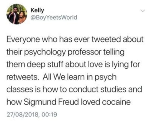 RocksoFreud, do a lot of cocaine🎵I feel like the majority of my psychology degree was just learning about other psychologists. Although I skipped a lot of my psych classes to focus on my biology labs since I was double majoring, so maybe that’s why I don’t remember much.