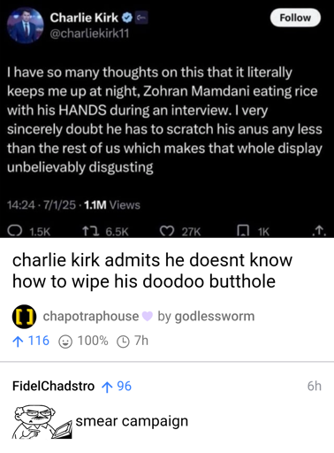 RedWizard [he/him, comrade/them]@hexbear.net to The best of Hexbear!@hexbear.netEnglish · 3 months agoSmear campaignhexbear.netimagemessage-square19linkfedilinkarrow-up1160arrow-down11