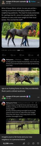 It is clear that this horse knows what he’s doing. Just give him oats and lady horses and let him run around and do his thing. Humans are fuckin’ weird.