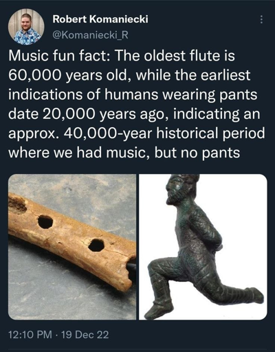 It is implied that the “earliest indication” of pants is the sculpture on the right, which makes it even more silly. It’s not even ancient cloth that was preserved to prove the existence of pants, but a stone sculpture that showed a person wearing them.