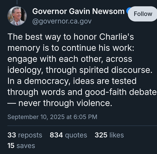 Yeah, he’s dog whistling. Anyone tuning in who never heard of the guy sees the governer making a pretty stock response to an assassination of a political adversary. Anyone who knows what is going on knows it’s tongue in cheek