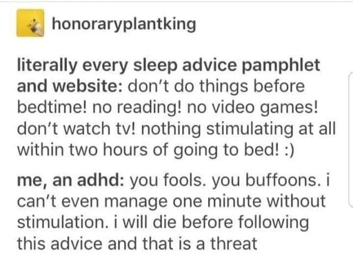 Anyways, the point of my comment was more to talk about my thoughts and experiences regarding sleep routines, and the fact that the “two hours of nothing stimulating before bed” is incredibly alien even to me, as a person who doesn’t have ADHD.