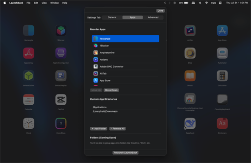 - Do note: The LaunchBack grid is not (yet) updated in real-time, and you must either Relaunch LaunchBack (available via a button at the bottom of the Settings window) or close and reopen the app manually to see changes. This applies for toggling manual and alphabetical sort, showing the rearranged apps in their new order, and custom app directories. Please do not submit issue requests regarding the grid not updating in real-time.