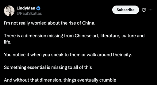 But westerners don’t like Japanese culture. They like icons of Japanese culture. Actually living there and navigating social situations can be very difficult compared to China. Korea too… Neoconfucianism is disgusting to me. Chinese people are way more welcoming, helpful, and easy to be friends with. Just also noisy 😆