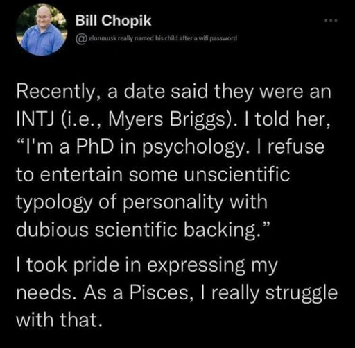 So many people I know through the workplace have done the Myers Briggs nonsense and hold onto their persona like a badge of pride. They’re well meaning, intelligent people who don’t know the background of MB and how it’s as scientifically rigorous as those paper chatterboxes we made in school to help you find out which boy you were going to marry by picking a colour.