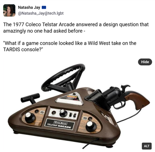 The 1977 Coleco Telstar Arcade answered a design question that amazingly no one had asked before: "What if a game console looked like a Wild West take on the TARDIS console?"
