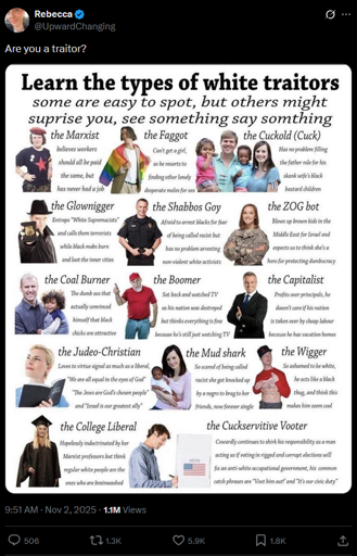 William Luther Pierce, author of the Turner Diaries and face of the American Neonazi movement for a time, was a vile fascist fuck but he at least had enough self-awareness to understand he hated the vast majority of white people (hence why his famous “work” involves the extermination of most of them along with Jews and non-whites). These people, on the other hand, are deluded enough to post this slop and not understand how alone they are. Ultimately, all racism comes down to misanthropy but this just makes it obvious. (Plus, it’s funny to go on about how much you hate brown/black people and white people who don’t see them as animals but then moralize about Zionists murdering brown kids)