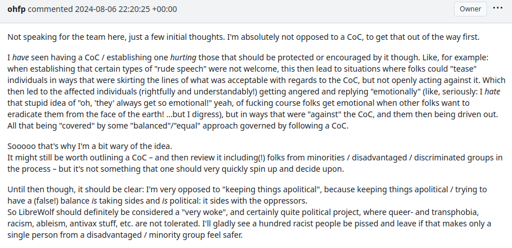 I’m not saying you shouldn’t have your beliefs or express them in your personal lives—everyone’s entitled to that. But when those beliefs get tied to LibreWolf, it can complicate things for the project and its community. I hope you’ll consider keeping LibreWolf a space that’s purely about the software: a tool for freedom, privacy, and open-source ideals. That’s what makes it special, and that’s why people like me turn to it.