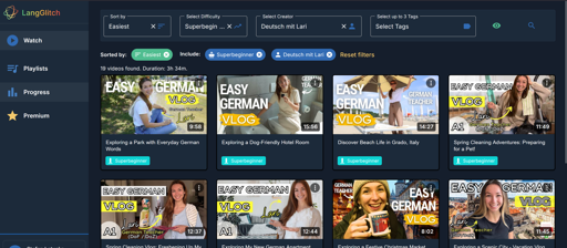 So I decided to build something for myself and ended up turning it into a proper project: LangGlitch – a little web app that aggregates comprehensible‑input videos for language learners. Right now it supports German, Vietnamese, and English, with playlists grouped by difficulty, tags, and creators. You can sort for “easiest”, filter for topics you like, and then just watch your way through material instead of hunting for the next decent video.