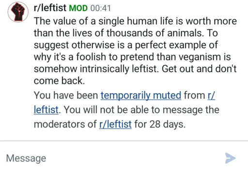 I guess we just exist in completely separate realities then. In the universe I’m from, the original post is about vegan discussion being banned from a subreddit and the mods of that subreddit justifying killing non-human animals by saying that their lives are worth less than human lives. The top level comment we’re replying to in my universe is a direct criticism of this logic.