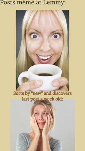 TimothyMcFuck @lemmy.ml · 3 years agoMe every time I go on lemmy and no one's herelemmy.mlimagemessage-square0linkfedilinkarrow-up11arrow-down10