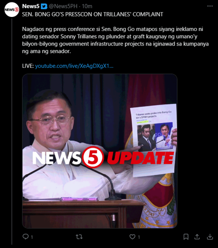arrow-up12arrow-down1imageSEN. BONG GO'S PRESSCON ON TRILLANES' COMPLAINTplus-squarelemmy.worldlechekaflan@lemmy.worldEnglish · 22 days agomessage-square0linkfedilink