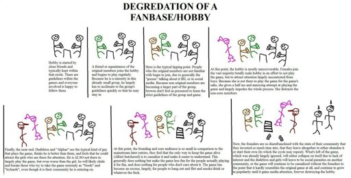 Also if the “originals” were happy with the game before they can just keep playing it that way with each other. The thing that tends to prevent that is a lack of control over the game itself, as it is a privately owned game trying to make money, not entertain you just 'cuz. And in that sense, the “originals” are misplacing their frustrations at not having the control to even just play their game with each other and putting the blame on others who are “playing it wrong”. The people forcing you to play with “casuals” or not at all are capitalists, not “females”.