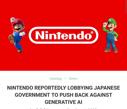 The manga and anime industry is actualy important and they are firmly against it. I don’t think Nintendo makes any difference at all in the current stage, maybe in the future. AI fan works are vastly unappealing and several Japanese fan sites already segregated AI works. Making purely AI slop gets view but very little real engagement and sales.