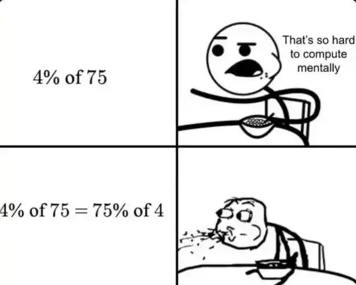 minus-squarejumjummy@lemmy.worldlinkfedilinkEnglisharrow-up6·edit-21 month agoWhat’s funny is that if someone said (a * b) * c is the same as (c * b) * a, you’d probably say “of course it is”. Same trick here if you show it as (4* 1/100) * 75 rewritten as (75 * 1/100) * 4.