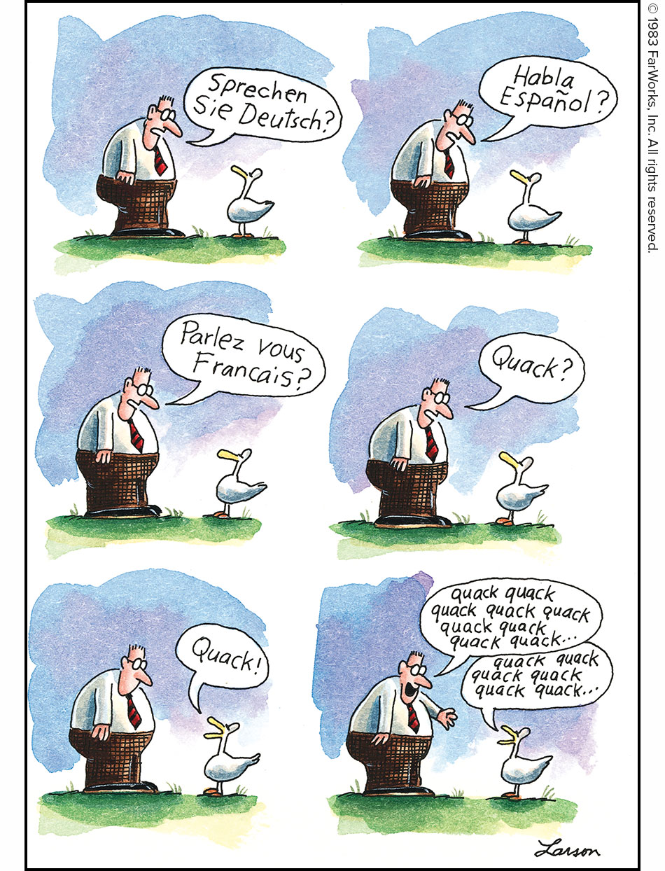 Sprechen sie Deutsch? / Habla Español? / Parlez vous Francais? / Quack? / Quack! /quack quack quack quack quack quack quack quack quack … / quack quack quack quack quack quack …