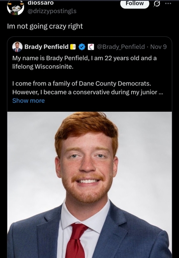 Is this the AI already cannibalizing itself? Just producing weaker and weaker nephews on the basis of currently “powerful” people? It looks like someone was playing with the DNA of Mr Beast, Don Jr and Connor McGregor, but the ai prompt was “wiscosnin guy boy man suit”.