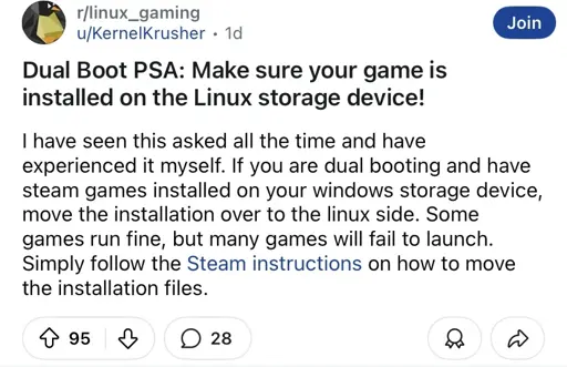 Yeah no, I disagree with you and agree with the Reddit post. I had games in my NTFS drive when I fully swapped Linux and they stood there for a year because I’m lazy and they ran fine, but taking the time to copy them to another brtfs drive, format the NTFS one to brtfs and swap them back, then reconfigure steam to rediscover the games sped up their performances because while the NTFS translation layer works incredibly well for what it’s doing, using an actual Linux native dusk format is just better.