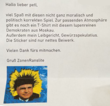 Besonders die Abbildung meines, in einer legitimen und unangefochtenen Wahl demokratisch gewählten, Lieblingsmoskauers werde ich selbstredend in der Arbeit und unterwegs tragen. Auf echt, die Sticker sind 10/10 und werden ihren gerechten Platz in meinem lokalen Beisl finden.