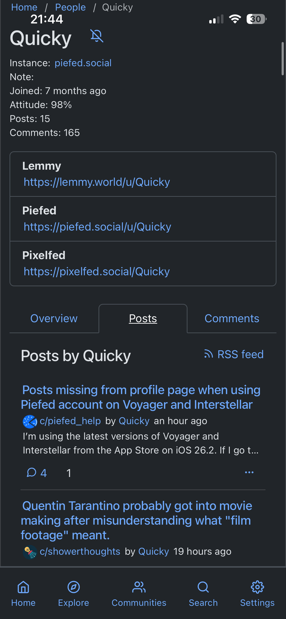 I’m using the latest versions of Voyager and Interstellar from the App Store on iOS 26.2. If I go to my account and try to view my previous posts, only one is displayed, and oddly it’s not even the most recent one. It’s the same single post on both apps