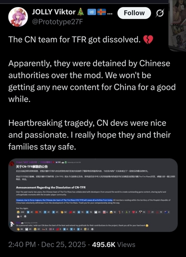 Though, yeah I’m curious why the PRC TFR devs withdrawed… Maybe because of the whole Gunther Fehlinger (WEF-aligned ultralib) pretty much streaming and endorsing TFR while the devs are amicable? The detention doesn’t seem to be confirmed just yet…