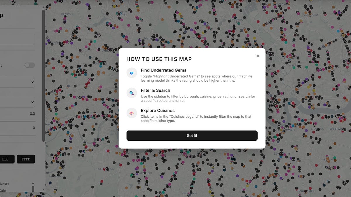 Thomas2024@feddit.org to Technik@feddit.org · 1 month agoHow Google Maps quietly allocates survival across London’s restaurants - and how I built a dashboard to see through itplus-squarelaurenleek.substack.comexternal-linkmessage-square1linkfedilinkarrow-up116arrow-down10